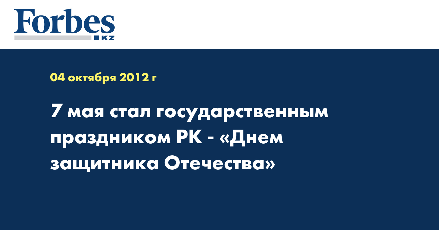 «Приказываю правительству Республики Казахстан внести в парламент проект закона «О внесении дополнения в закон РК «О праздниках в РК», предусматривающий установление 7 мая государственным праздником Республики Казахстан – «Днем защитника Отечества», - говорилось в документе, опубликованном в официальной печати 4 мая текущего года.