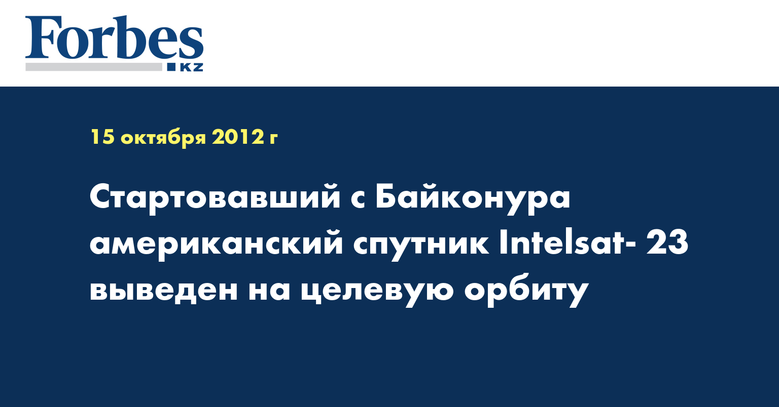 Стартовавший с космодрома Байконур космический аппарат «Intelsat- 23» после отделения от разгонного блока «Бриз-М» ракеты космического назначения (РКН) «Протон-М» был выведен на целевую орбиту, сообщил 15 октября утром КазТАГ со ссылкой на пресс-службу Федерального космического агентства.