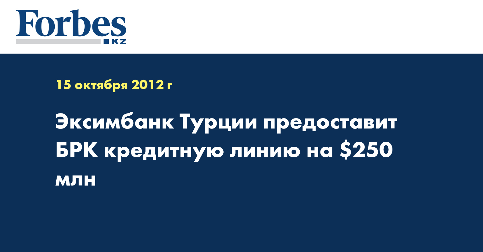 «БРК и «Экспортно-кредитный банк Турции» (Эксимбанк Турции) подписали меморандум о взаимопонимании, предусматривающий предоставление кредитной линии для БРК на сумму $250 млн», - говорится в сообщении, распространенном в понедельник.