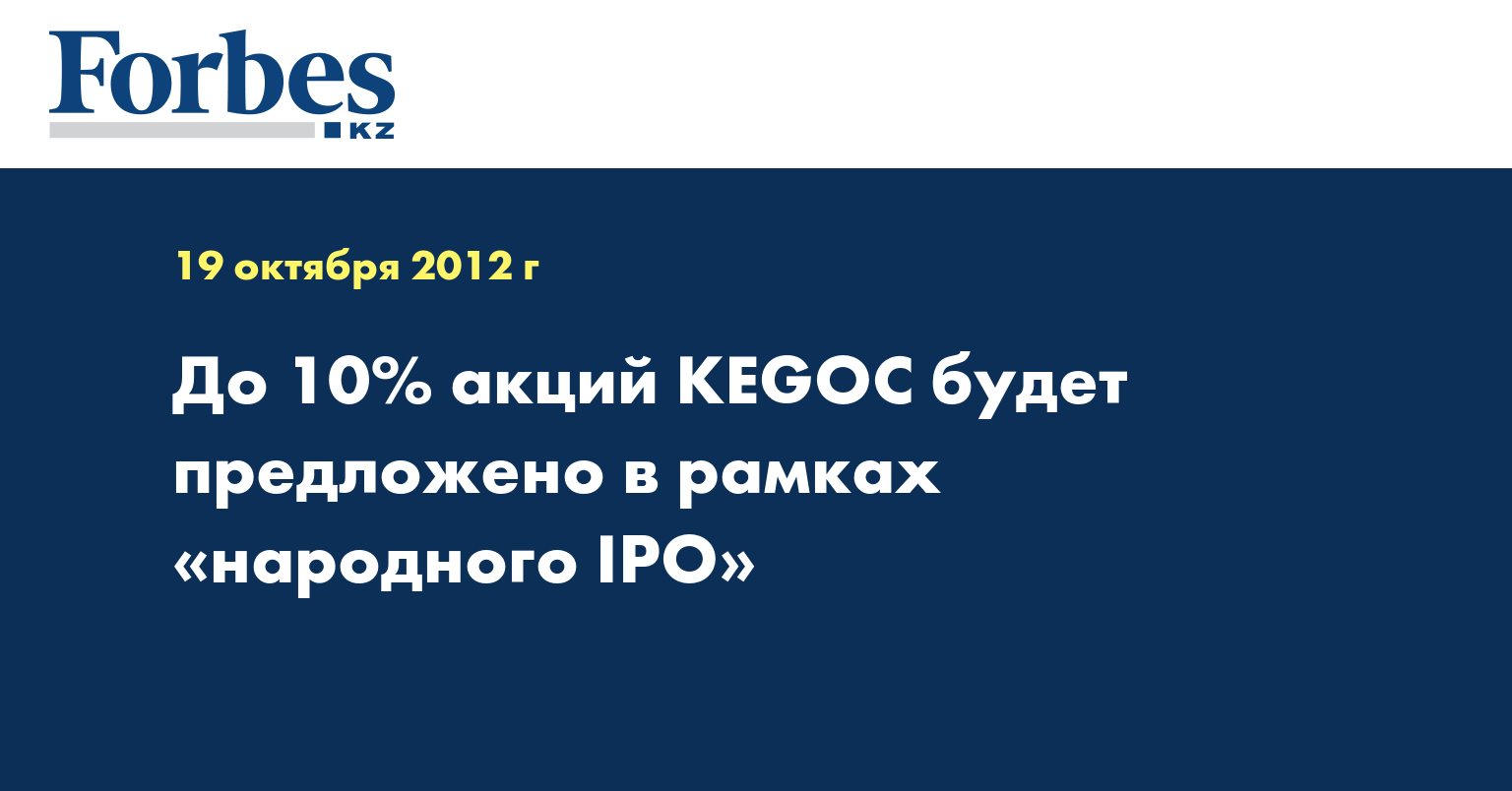 Казахстан планирует продать до 10% акций AO «Казахстанская компания по управлению электрическими сетями» (KEGOC) в ходе «народного IPO» во II квартале 2013 года, сообщило агентство Reuters.