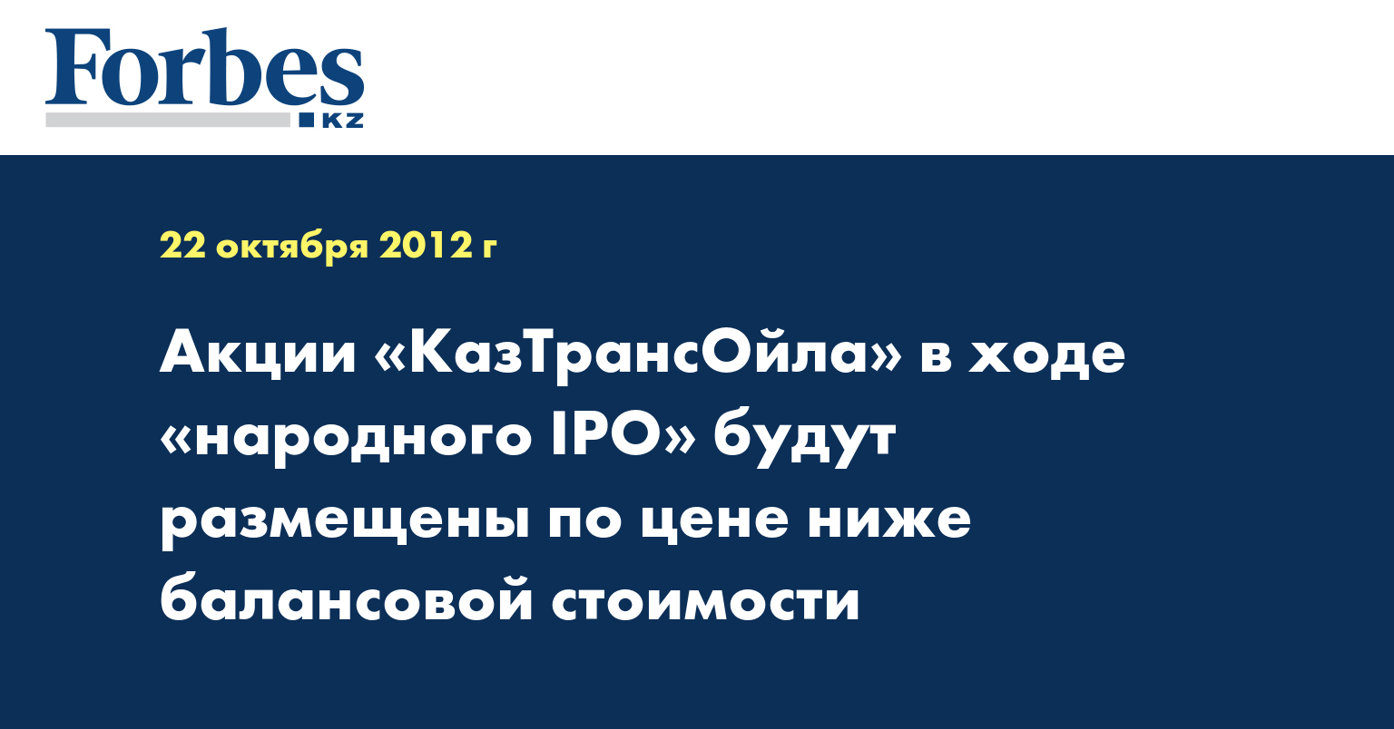 Простые акции АО «КазТрансОйл» (КТО) в рамках программы «народного IPO» будут размещаться по цене ниже балансовой стоимости, сообщил источник, близкий к АО «ФНБ «Самрук-Казына».