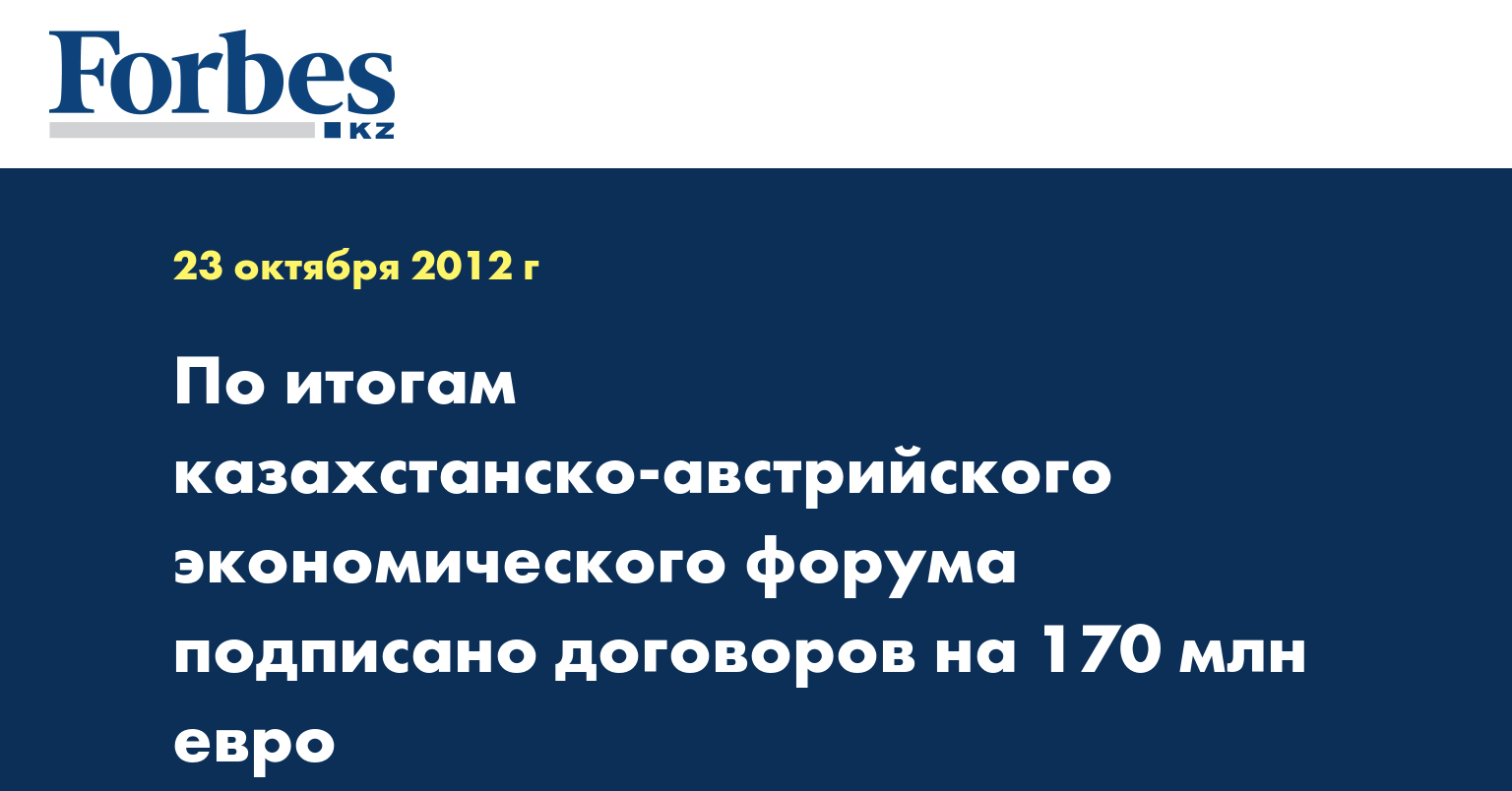 «Результатом прошедшего сегодня в Вене казахстанско-австрийского экономического форума стало подписание 19 документов на общую сумму 170 млн евро. Деловое мероприятие прошло с участием президента РК Н.А.Назарбаева, находящегося в Австрии с официальным визитом, и федерального президента РА Х.Фишера», - говорится в пресс-релизе, распространенном во вторник.