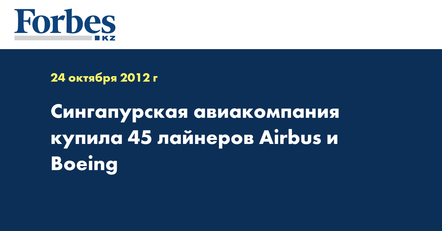 Singapore Airlines (SIA) заказала у Airbus пять самолетов A380 и 20 авиалайнеров A350. Об этом сообщает "Лента.ру" со ссылкой на пресс-релиз авиакомпании. Стоимость заказа по каталожным ценам составляет 7,5 миллиарда долларов. Поставки начнутся в 2017 году.