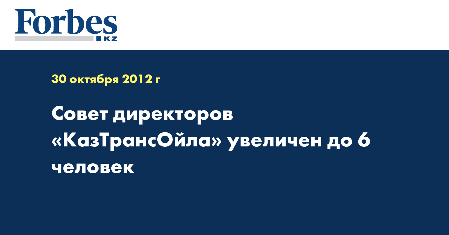 «Решением совета директоров АО НК «КазМунайГаз» от 19 октября 2012 года (протокол 8/2012) увеличен количественный состав совета директоров АО «КазТрансОйл» до шести человек», - говорится в сообщении, помещенном на сайте компании, которое цитирует КазТАГ.