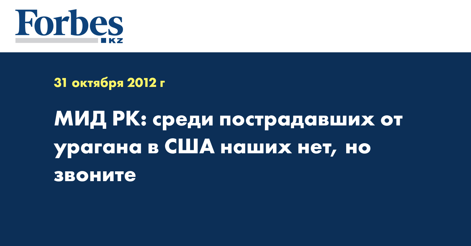 Граждан Казахстана нет среди пострадавших от урагана «Сэнди» в США, говорится в официальном заявлении министерства иностранных дел (МИД) РК.