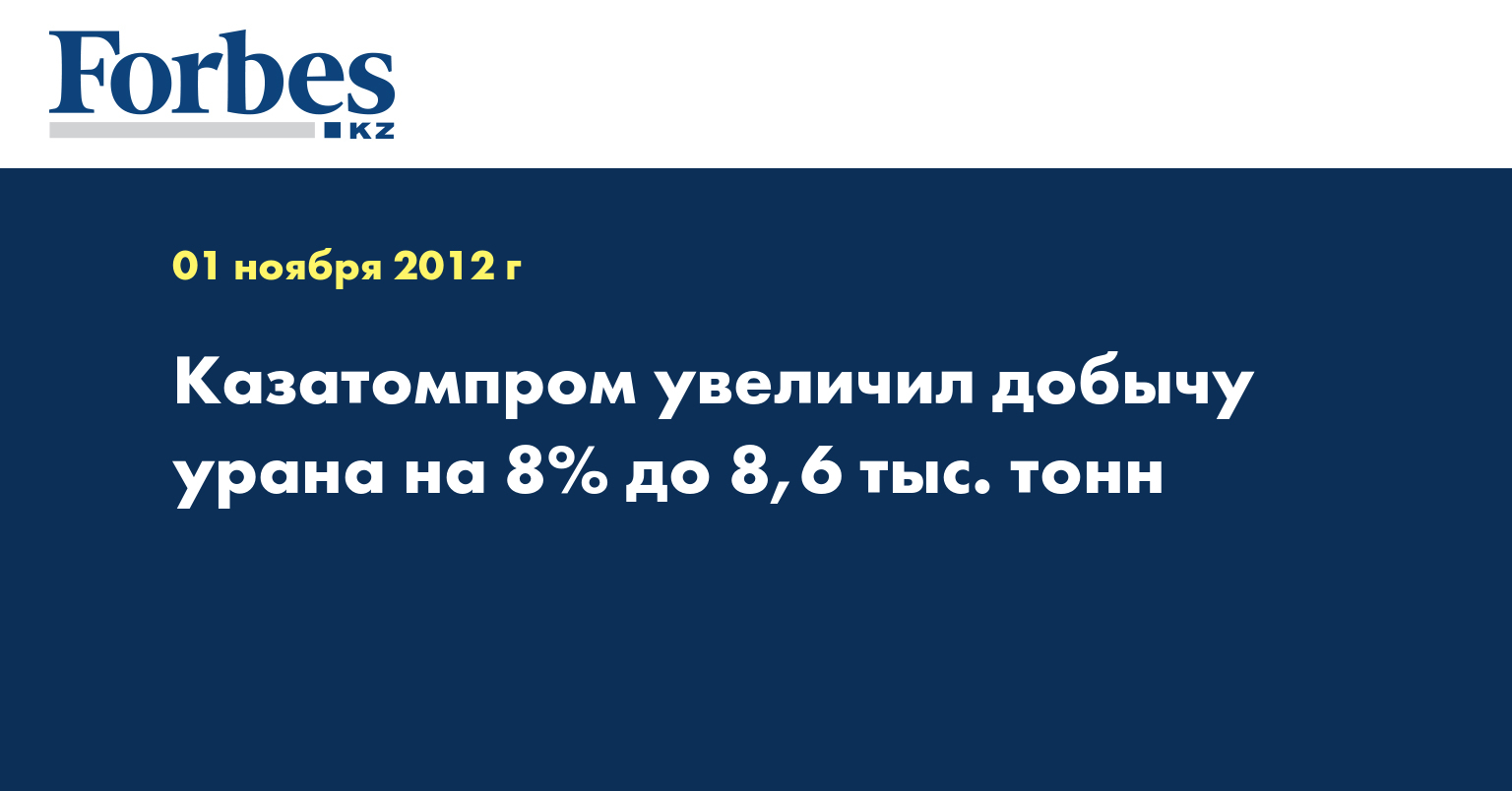 АО «НАК «Казатомпром» увеличило в январе-сентябре 2012 года добычу урана на 8% по сравнению с аналогичным показателем годом ранее - до 8,6 тыс. тонн, сообщила пресс-служба компании.