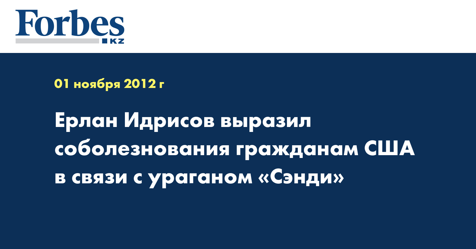 «Министр иностранных дел Республики Казахстан Ерлан Идрисов направил письмо соболезнования госсекретарю США Хилари Клинтон в связи с разрушительными последствиями урагана «Сэнди», - указывается в сообщении, которое цитирует КазТАГ.