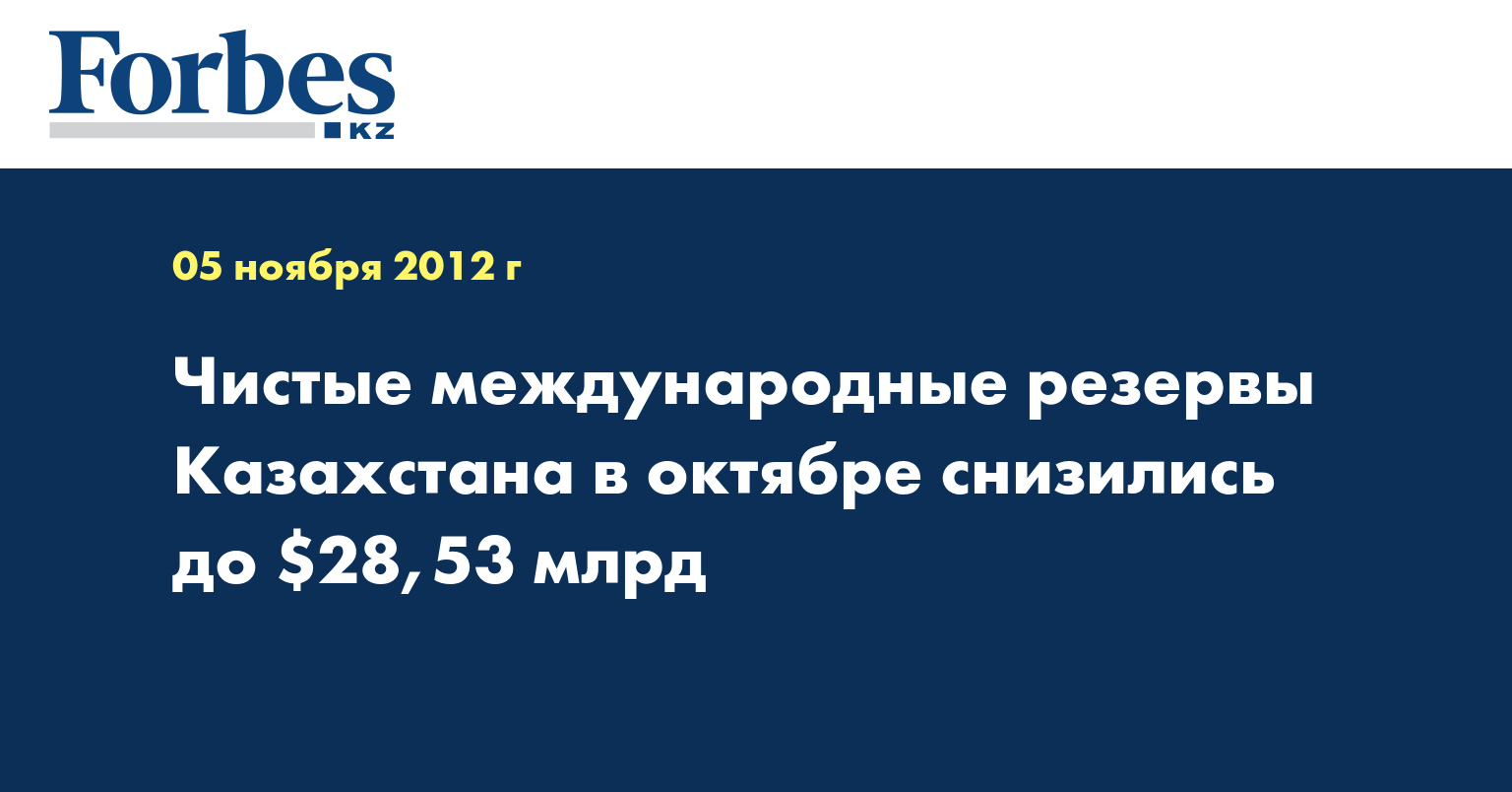 Чистые международные резервы Казахстана в октябре 2012 года за месяц снизились на 3,49% до $28,526 млрд, с начала года сократились на 0,84%. Такие данные опубликованы на сайте Национального банка РК в понедельник, передает КазТАГ.