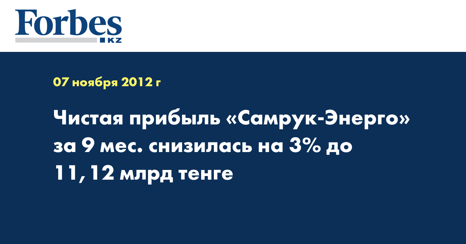 Чистая прибыль АО «Самрук-Энерго» за январь-сентябрь 2012 года снизилась на 3% до Т11,124 млрд, сообщила пресс-служба компании сотрудникам КазТАГ.