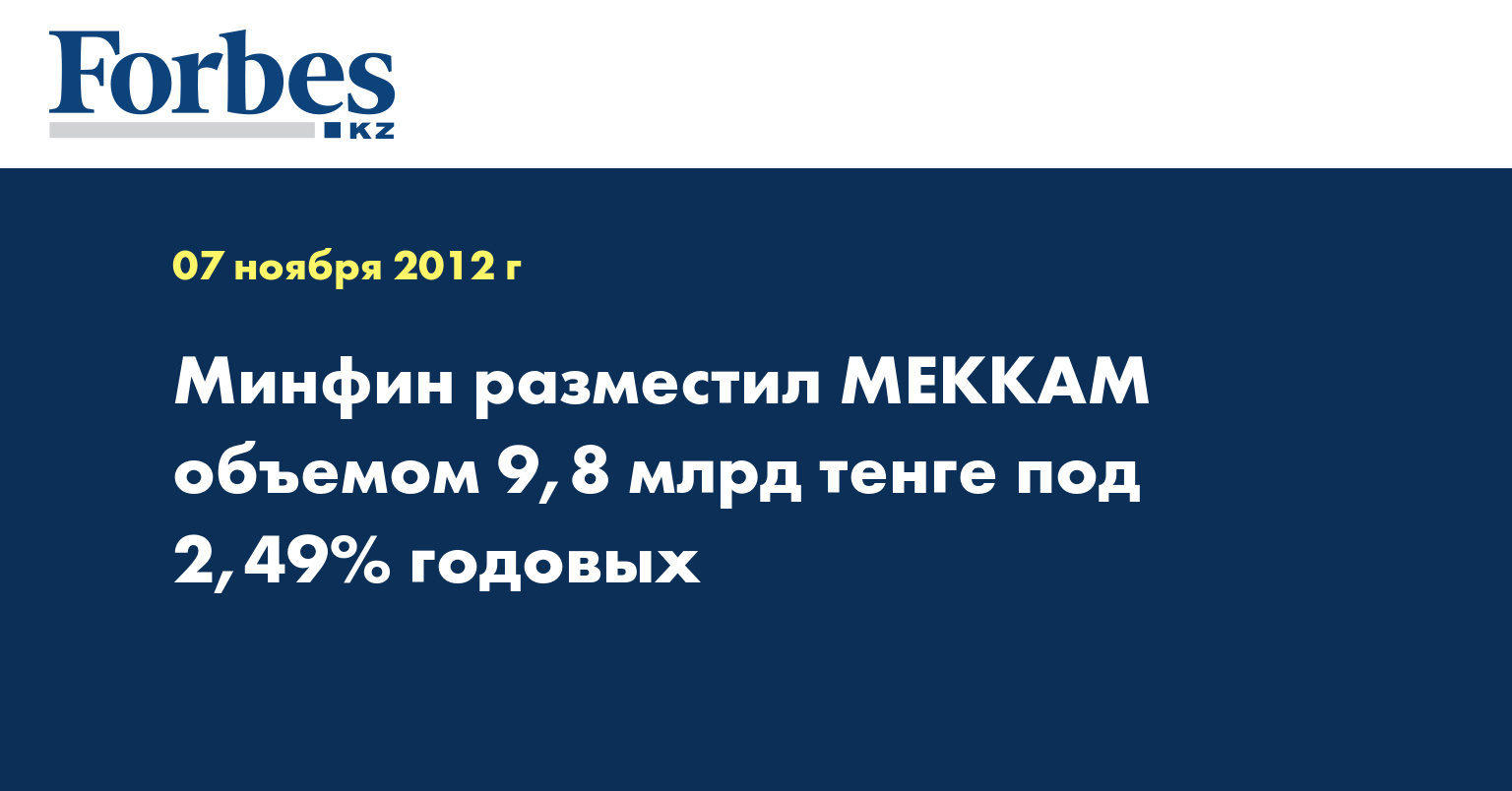 «Министерство финансов Казахстана разместило на KASE 7 ноября 100 млн МЕККАМ-9 выпуска 18… на сумму Т9,8 млрд под 2,49% годовых», - указывается в сообщении, опубликованном на сайте биржи, который цитирует КазТАГ.