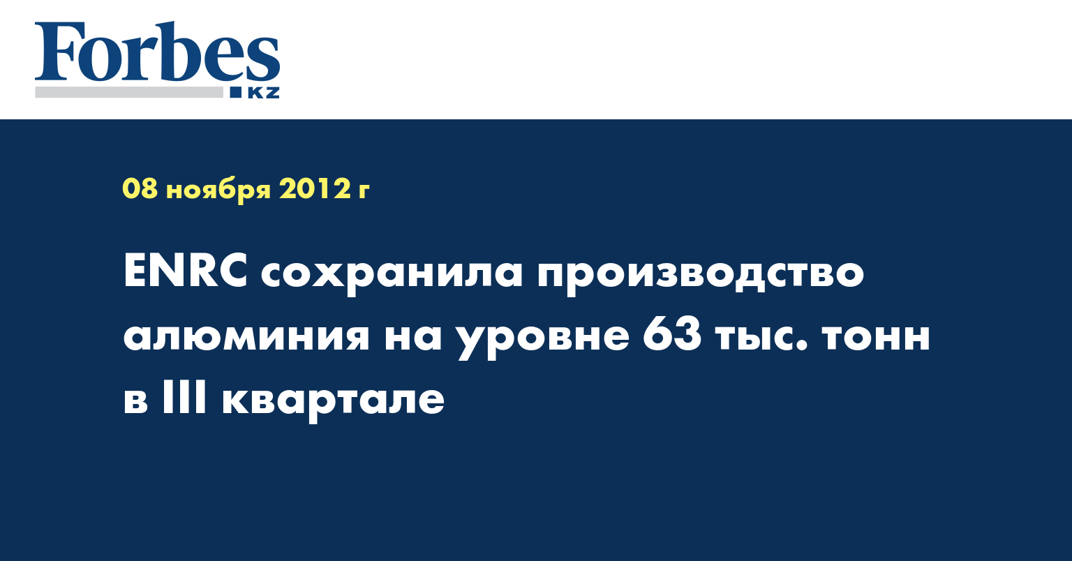 Eurasian Natural Resources Corporation Plc (ENRC) в III квартале произвела 63 тыс. тонны алюминия, что соответствует показателю аналогичного периода 2011 года, указывается в сообщении корпорации корреспондентам КазТАГ.