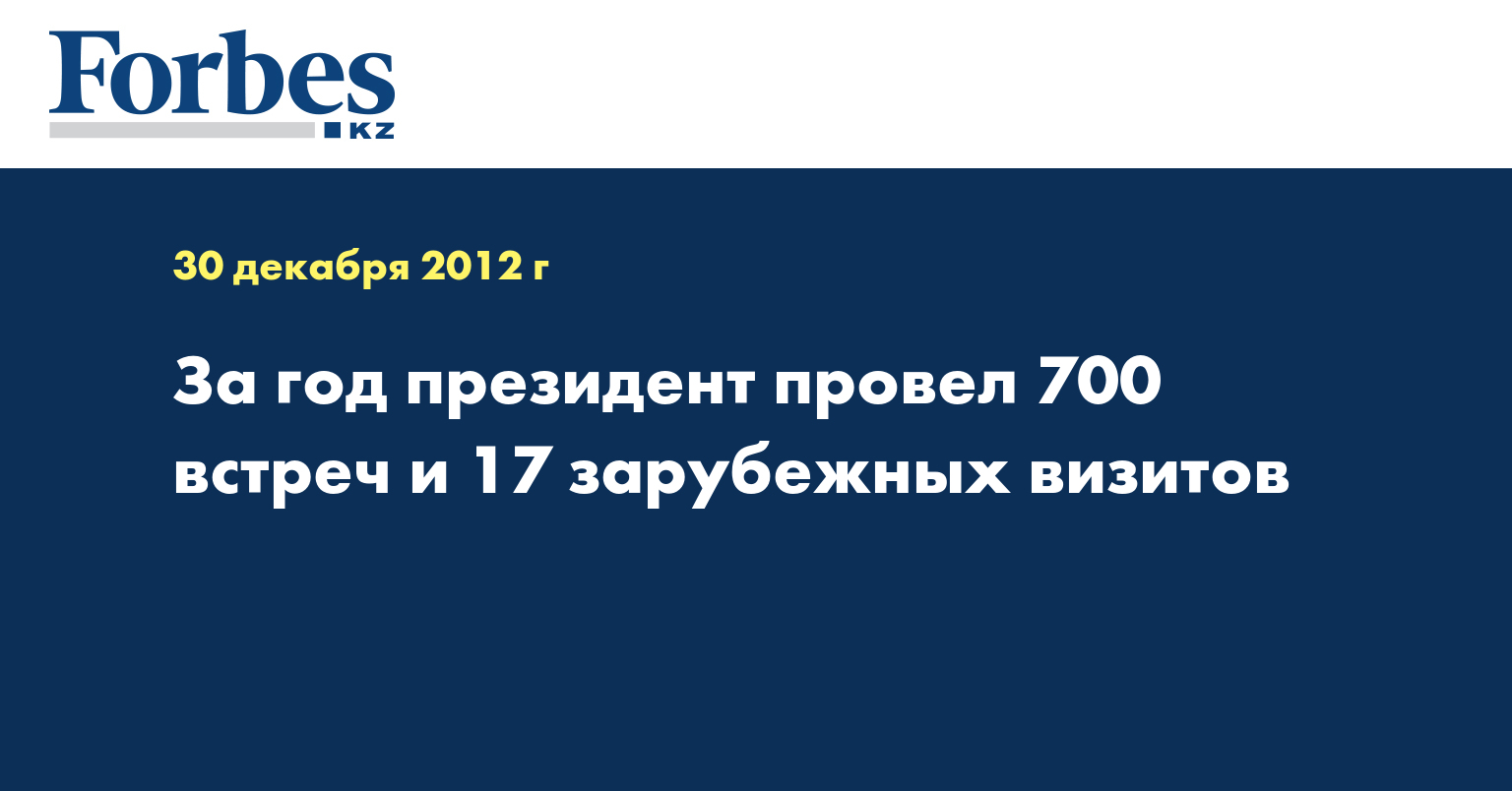 В 2012 году президент Казахстана Нурсултан Назарбаев провел 700 протокольных встреч и 17 зарубежных визитов.