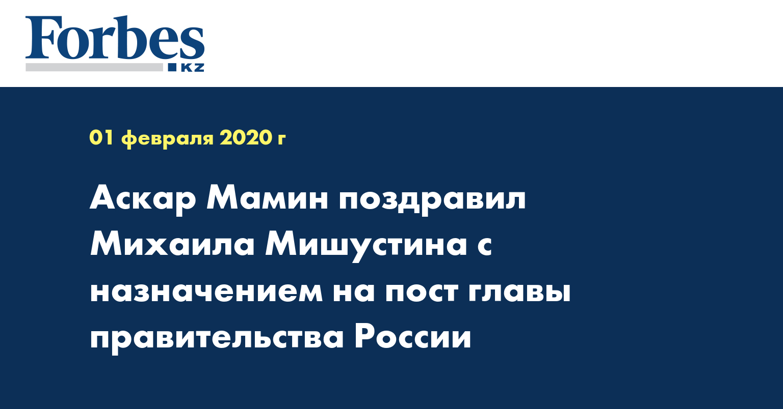 Премьер-министр РК Аскар Мамин поздравил Михаила Мишустина с назначением на пост главы правительства России, передает корреспондент МИА «Казинформ».