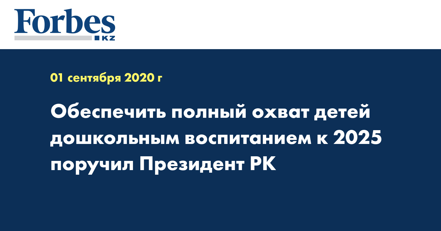 Президент Казахстана Касым-Жомарт Токаев поручил обеспечить стопроцентный охват детей до шести лет дошкольным воспитанием и обучением к 2025 году, передает корреспондент МИА «Казинформ».