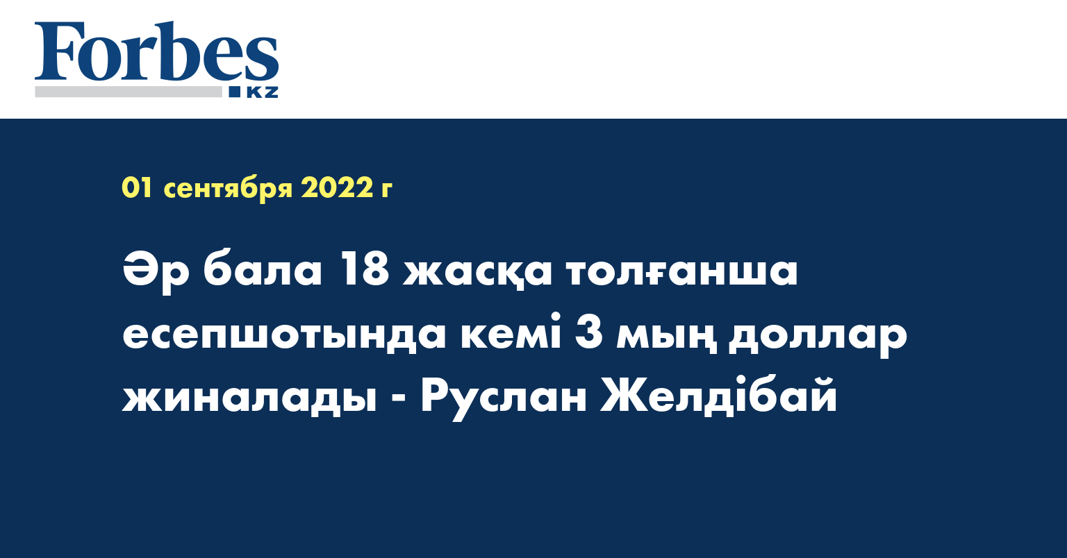 «Президенттің бастамасымен Балалар жылының аясында «Ұлттық қор – балаларға» атты жаңа бағдарлама іске қосылады. Оған сәйкес, 2024 жылдан бастап Ұлттық қордың жыл сайынғы инвестициялық табысының 50 пайызы балалар 18 жасқа толғанға дейін олардың арнаулы жинақтаушы есепшотына аударылады. Жинақталған қаржы балалар кәмелет жасына толғаннан кейін олардың баспана немесе білім алуына жұмсалады», - деп жазды Руслан Желдібай Facebook парақшасында.