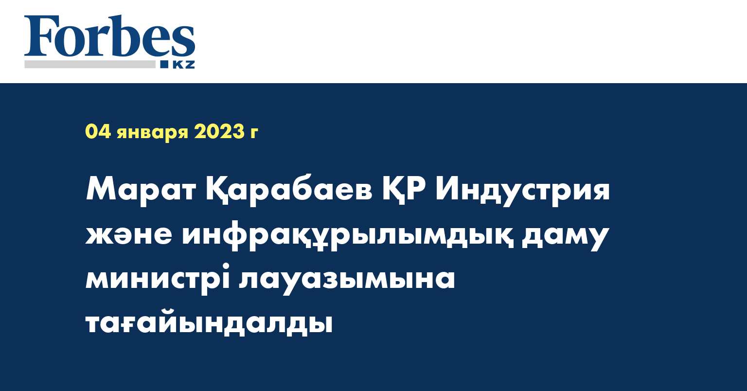 Мемлекет басшысының Жарлығымен Марат Кәрімжанұлы Қарабаев Қазақстан Республикасының Индустрия және инфрақұрылымдық даму министрі лауазымына тағайындалды.