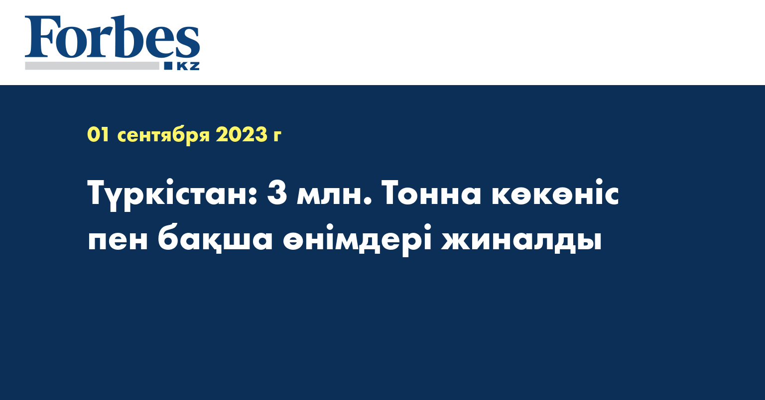 Түркістан облысында егістікті әртараптандырудың нәтижесінде 3 млн. тонна көкөніс, бақша, картоп өнімдері жиналды. Жыл соңына дейін өнім көлемін арттыру көзделген.