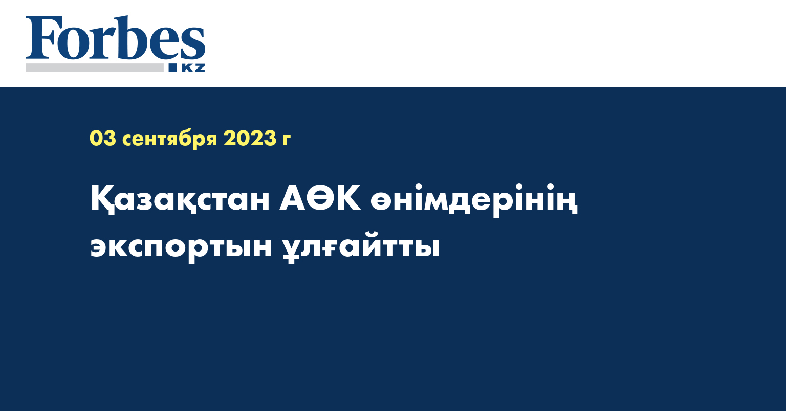АӨК-тің өңделген өнімінің экспорты бірінші жартыжылдықта $1,1 млрд құрады, бұл 2022 жылғы 6 айдағы көрсеткішінен 5%-ға көп ($1 млрд). Аталған кезеңде АӨК өнімі экспортының жалпы көлеміндегі өңделген өнімнің үлесі 40,1%-ды құрады.