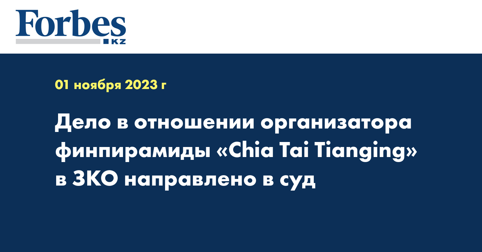 Дело в отношении организатора структурного подразделения финпирамиды «Chia Tai Tianging Pharmaceutical» на территории Западно-Казахстанской, Актюбинской и Атырауской областей завершено Департаментом АФМ по ЗКО и направлено в суд, сообщает пресс-служба АФМ.
