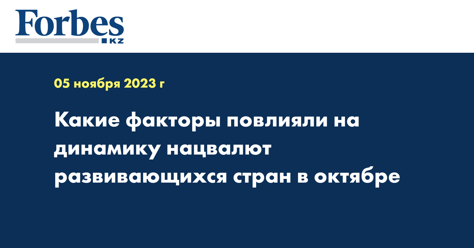 Снижение глобального риск-сентимента на внешних рынках в октябре продолжилось на фоне эскалации геополитической ситуации на мировой арене. Стабильная инфляция в США выше прогнозируемых значений и ожидания по дальнейшему повышению ставок со стороны ФРС США также способствовали снижению «аппетита к риску» у глобальных инвесторов. Индекс доллара США DXY демонстрировал волатильность, незначительно укрепившись за октябрь на 0,5%, сообщает пресс-служба Нацбанка РК.