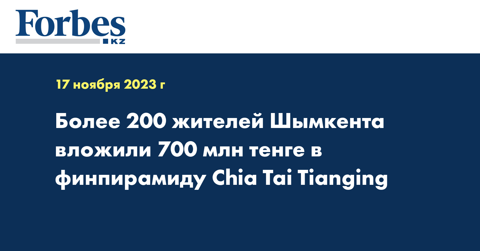 Расследование в отношении руководителя структурного подразделения финансовой пирамиды Chia Tai Tianging завершено департаментом АФМ по городу Шымкент.