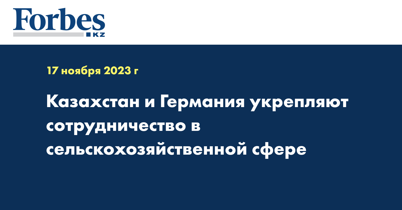 Для укрепления отношений двух стран 15-17 ноября 2023 года состоялся визит казахстанской делегации в Берлин во главе с первым заместителем премьер-министра РК Романом Скляром. В рамках визита вице-министр сельского хозяйства РК Абулхаир Тамабек встретился со статс-секретарем при Федеральном министре сельского хозяйства и продовольствия ФРГ доктором О. Ник.