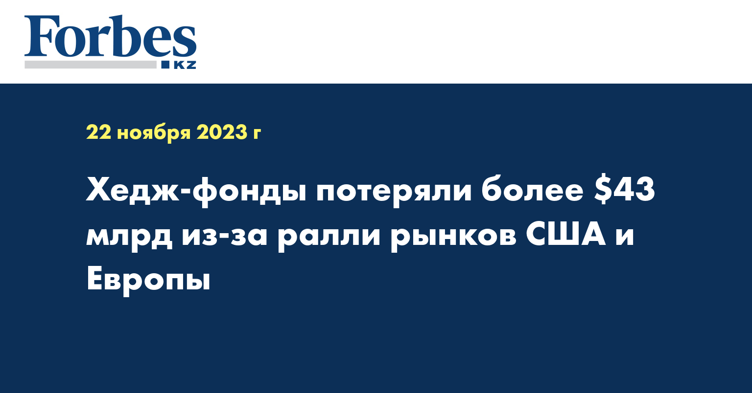 Хедж-фонды за четыре дня потеряли $43,2 млрд, ставя на снижение американских и европейских фондовых рынков, которые в последние несколько дней резко выросли, пишет Financial Times со ссылкой на данные исследовательской группы S3 Partners. Данные приведены за 14–17 ноября включительно по коротким позициям, в них не учитывается прибыль, которую фонды могли получить от других акций, передает Forbes.ru.