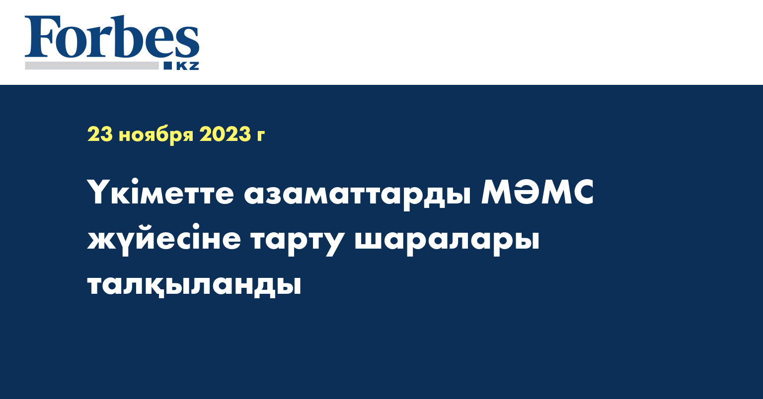 Міндетті медициналық сақтандыру жүйесіне 3,3 млн қазақстандық тартылады. Азаматтардың 15 санаты, оның ішінде әлеуметтік жағынан аз қамтылған азаматтар үшін тиісті жарналар мемлекет есебінен аударылады. Жұмысты үйлестіру мақсатында Денсаулық сақтау министрлігі жанында жобалық кеңсе құрылды, аймақтарда штабтар құрылып, шаралардың бірыңғай алгоритмі жасалды.
