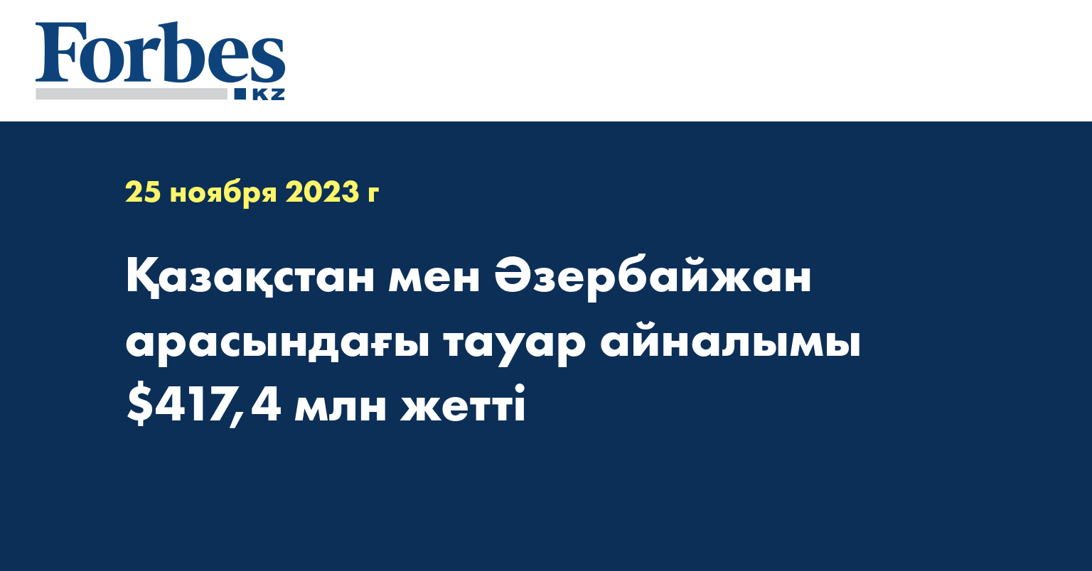 2023 жылдың 9 айының қорытындысы бойынша Қазақстан мен Әзербайжан арасындағы сауда көлемі 417,4 млн долларға жетті. Бұл көрсеткіш, өткен жылдардың ұқсас кезеңімен салыстырғанда, рекордтық болып табылады, сондай-ақ 2022 жылдың 9 айындағы көрсеткіштен (316,4 млн долл.) 31,9%-ға артық, деп хабарлайды ҚР Ұлттық экономика министрлігі.