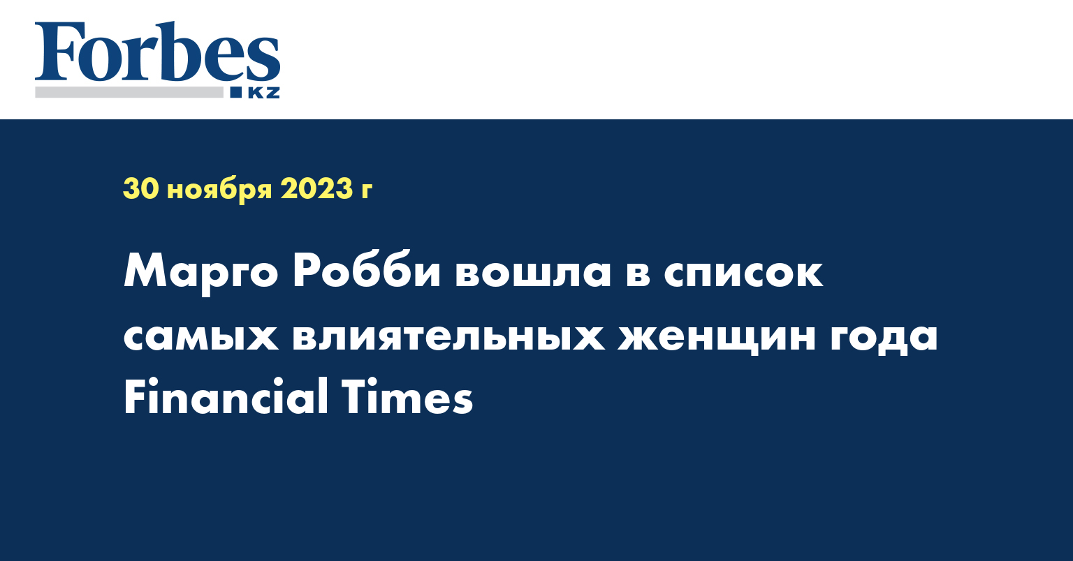 Британская газета Financial Times (FT) опубликовала список 25 самых влиятельных женщин 2023 года. В него в том числе вошла актриса Марго Робби, известная по фильмам «Барби», «Волк с Уолл-стрит» и «Отряд самоубийц», передает Forbes.ru.