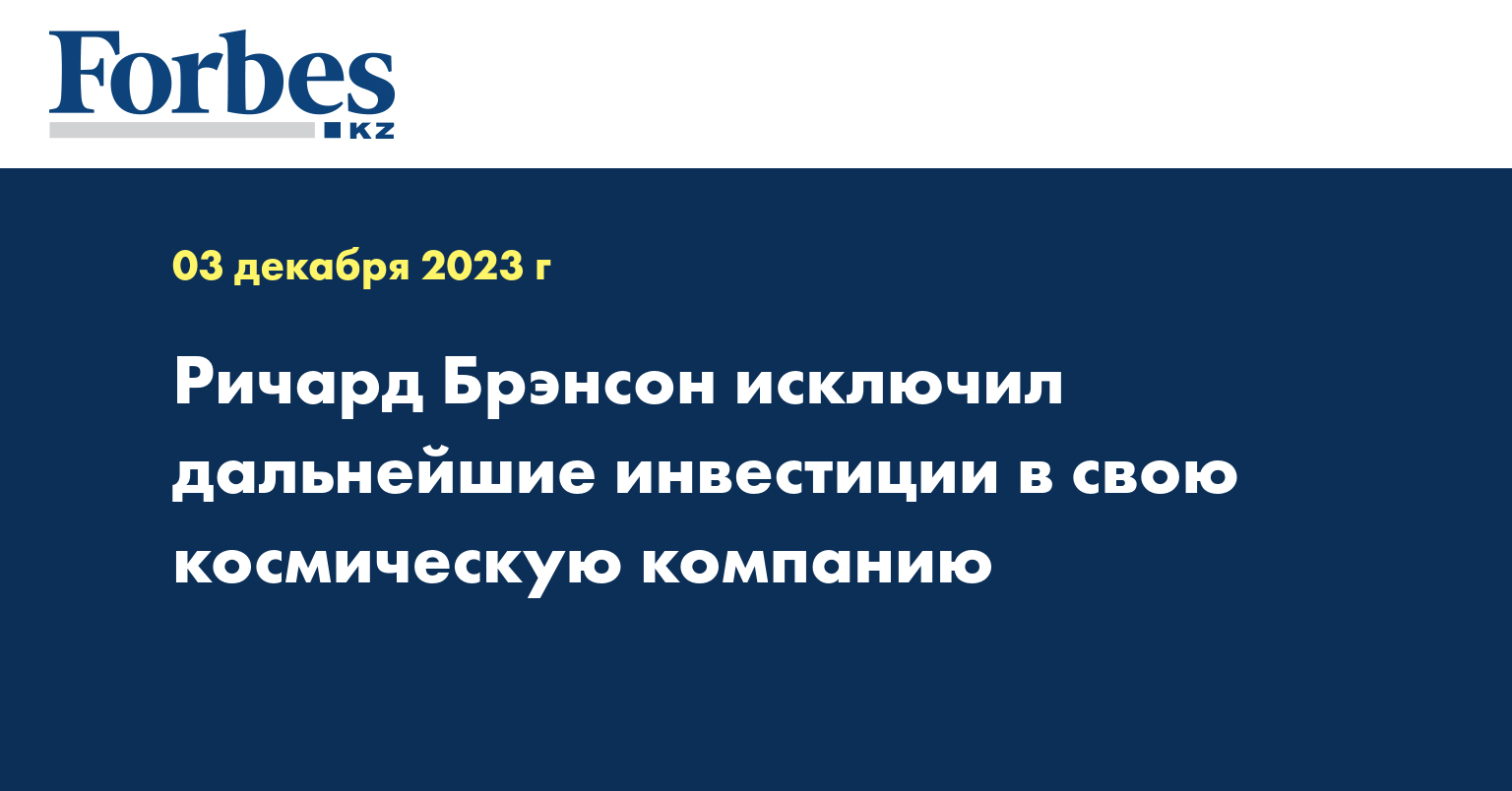 Британский миллиардер Ричард Брэнсон (состояние, по данным Forbes Real-Time, $2,9 млрд) заявил, что больше не будет вкладывать деньги в свою убыточную компанию по организации космических путешествий Virgin Galactic. Об этом он сказал в разговоре с Financial Times, передает Forbes.ru.
