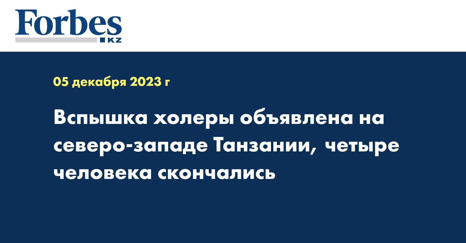 По меньшей мере четыре человека скончались от холеры, десятки заразились в области Кагера на северо-западе Танзании. Об этом сообщила в понедельник областной комиссар Фатма Мвасса на пресс-конференции в городе Букоба, передает Синьхуа.