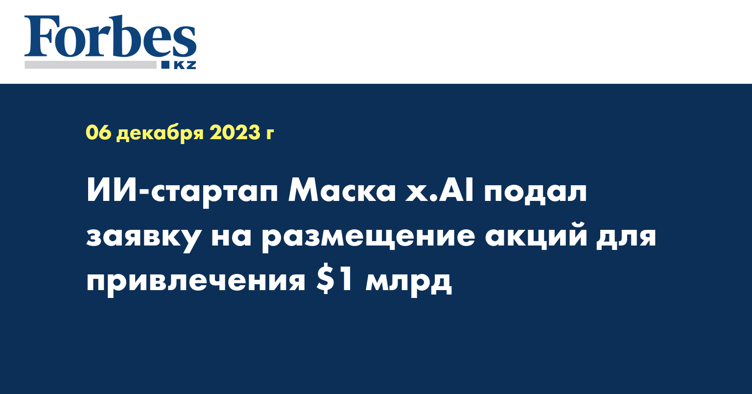 x.Al, стартап в области искусственного интеллекта, основанный Илоном Маском, подал в Комиссию по ценным бумагам и биржам США (SEC) заявку на привлечение до $1 млрд путем размещения акций среди инвесторов, передает CNBC. В ноябре Маск заявил, что инвесторам X будет принадлежать 25% x.AI, отметил канал, передает Forbes.ru.