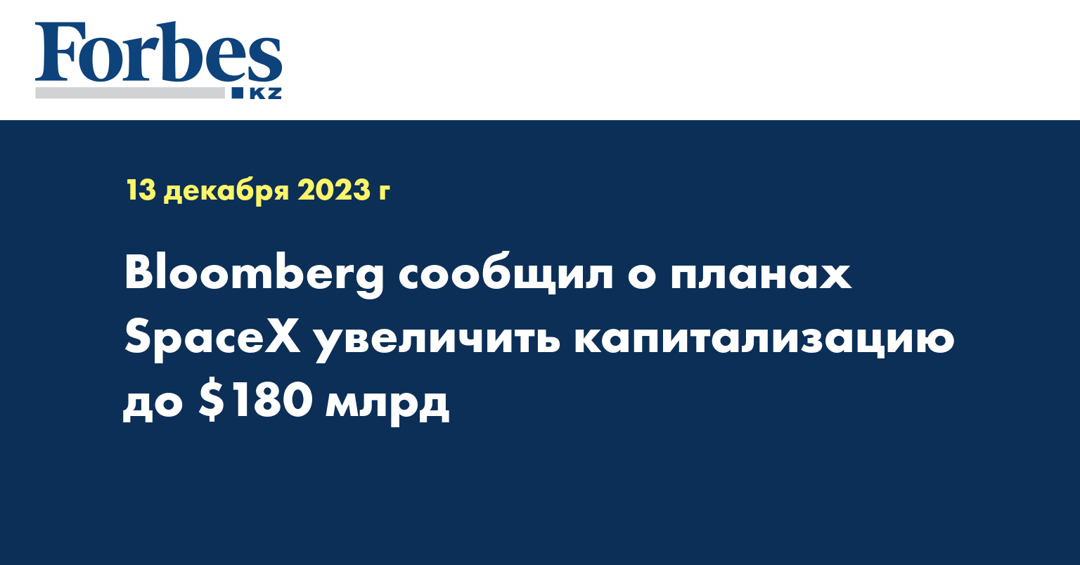 SpaceX планирует продажу своих акций по цене $97 за бумагу, что подразумевает оценочную стоимость компании Илона Маска почти в $180 млрд, пишет Bloomberg со ссылкой на источники, знакомые с обсуждениями,передает Forbes.ru.