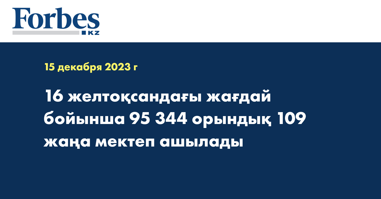 16 желтоқсан қарсаңында елімізде 7344 орындық 13 жаңа мектептің ашылуы жоспарлануда. Осылайша, жыл басынан бері пайдалануға берілетін 95 344 орындық жаңа мектептердің саны 109-ды құрайды.