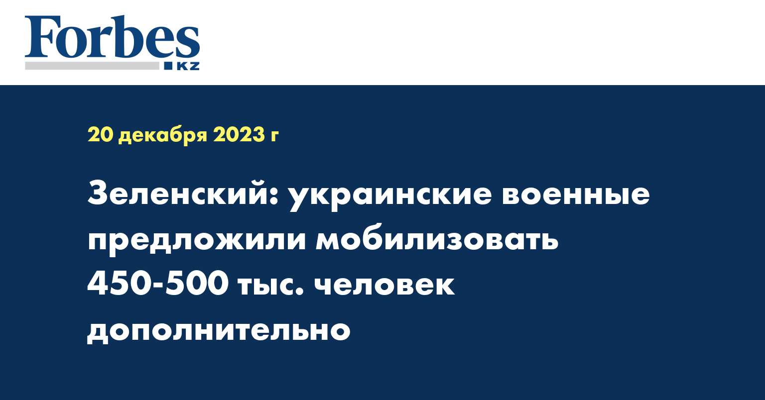 Президент Украины Владимир Зеленский заявил во вторник, что украинские военные предложили мобилизовать в вооруженные силы страны еще 450-500 тысяч человек, передает "Голос Америки".