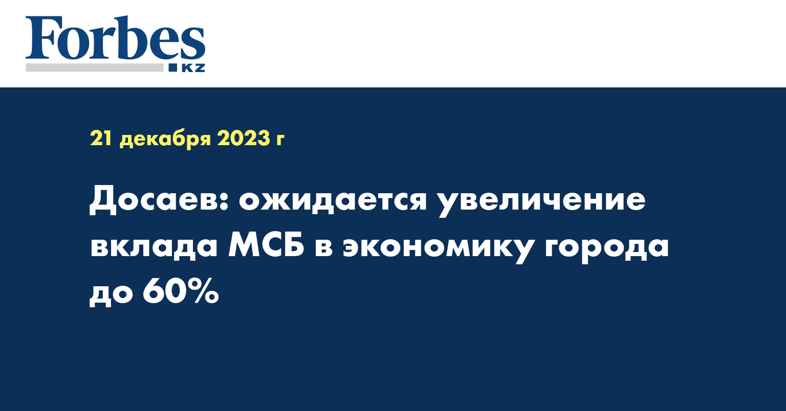 Поддержка МСБ является одним из основных приоритетов в работе акимата города Алматы. Он занимает особую роль в экономике мегаполиса и занятости алматинцев. Ожидается увеличение вклада МСБ в экономику города до 60%. Такими данными поделился глава мегаполиса Ерболат Досаев, выступая на площадке Службы центральных коммуникаций.