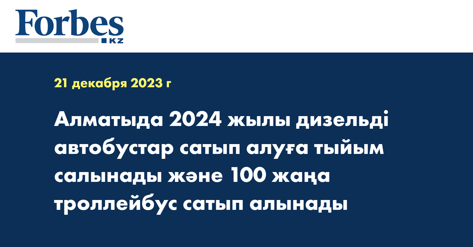 Алматыда даму бағдарламасын іске асыру аясында қоғамдық көлікті басым дамыта отырып, қаланың тұрақты көлік құрылымы қалыптасуда. Ағымдағы жылы қаланың автобус паркі 1 150 экологиялық таза автобусқа жаңартылды (оның ішінде жеке тасымалдаушылардың алғаны – 550). 2024 жылдан бастап жеке тасымалдаушылардың дизельдік автобустарды сатып алуына тыйым салуды енгізу жоспарлануда. Бұл туралы Алматы әкімі Ерболат Досаев Астанада өткен ОКҚ брифингінде сөйлеген сөзінде айтты.