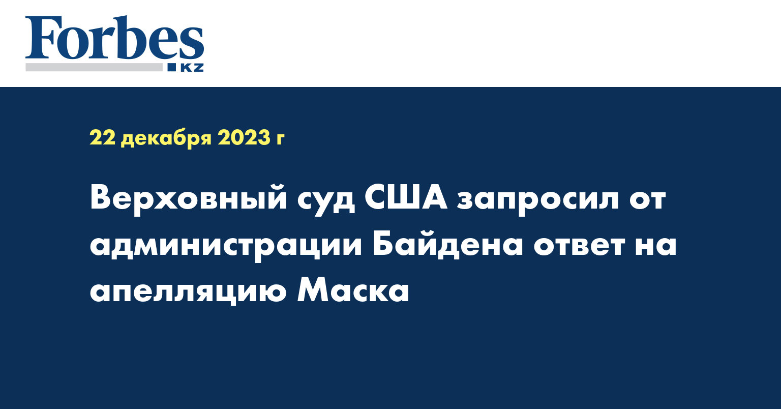 Верховный суд США попросил администрацию президента Джо Байдена ответить на апелляцию Илона Маска, который требует признать недействительным соглашение с Комиссией по ценным бумагам и биржам (SEC) о предварительной проверке его сообщений в социальных сетях о Tesla, передает Bloomberg. Судьи направили свой запрос генеральному солиситору США, адвокату администрации Байдена в Верховном суде Элизабет Прелогар, передает Forbes.ru.
