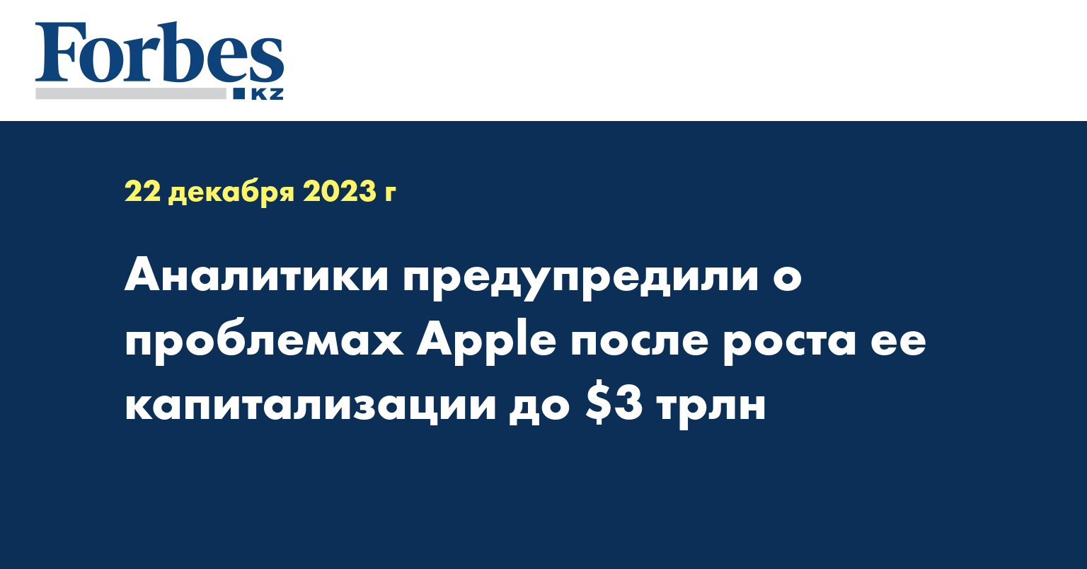 Рыночная стоимость Apple в 2023 году выросла почти на $1 трлн, до $3,03 трлн. Однако это ралли будет сложно оправдать в 2024-м из-за проблем компании, пишет Bloomberg со ссылкой на аналитиков. Рост акций Apple на 50% в 2023 году спровоцировали ставки инвесторов на то, что компания продолжит получать большую прибыль вне зависимости от состояния экономики, пишет Bloomberg. Сейчас оценка компании в 29 раз превышает прогнозируемую в 2024 году прибыль, а также почти вдвое превышает среднюю капитализацию за 10 лет, отмечает агентство