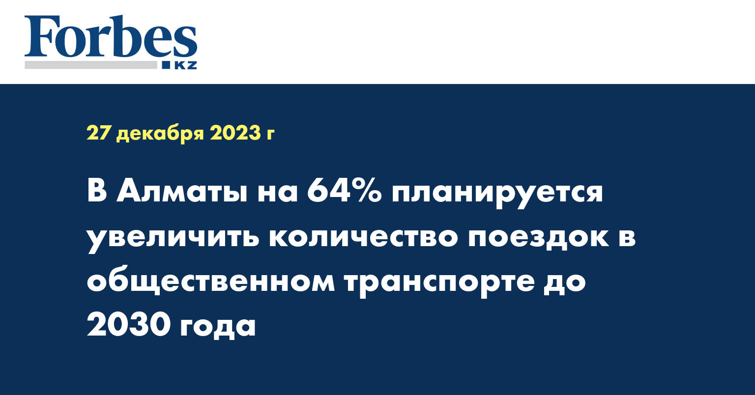 Цель мастер-плана – повысить городскую мобильность Алматы и до 2030 года увеличить на 64% количество поездок в общественном транспорте. Основным драйвером роста данного показателя должен стать модальный сдвиг с переключением населения с личного транспорта на общественный.