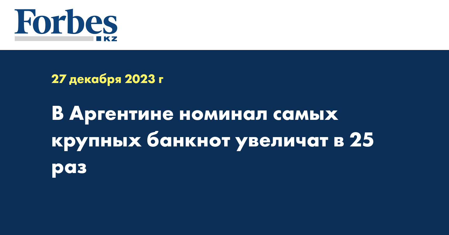 ЦБ Аргентины выпустит банкноты, номинал которых будет увеличен в 25 раз по сравнению с самыми крупными купюрами, находящимися в обороте, передает La Nacion со ссылкой на президента страны Хавьера Милея. Это решение принято в связи с высоким уровнем инфляции, передает Forbes.ru.
