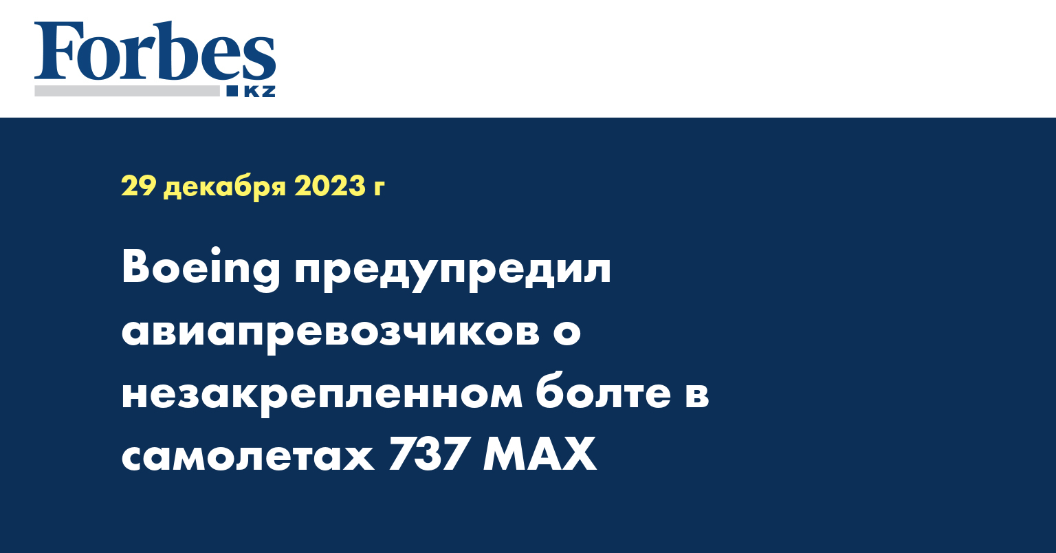 Американский авиастроительный концерн Boeing призвал авиакомпании проверить самолеты 737 MAX, поскольку в системе управления рулем может быть ослаблен болт, сообщило Федеральное управление гражданской авиации США (FAA). «По согласованию с FAA компания Boeing выпустила сообщение для операторов новых узкофюзеляжных самолетов с призывом проверить конкретные рулевые тяги, контролирующие движение руля направления, на предмет возможного незакрепленного оборудования», — говорится в сообщении регулятора, передает Forbes.ru.