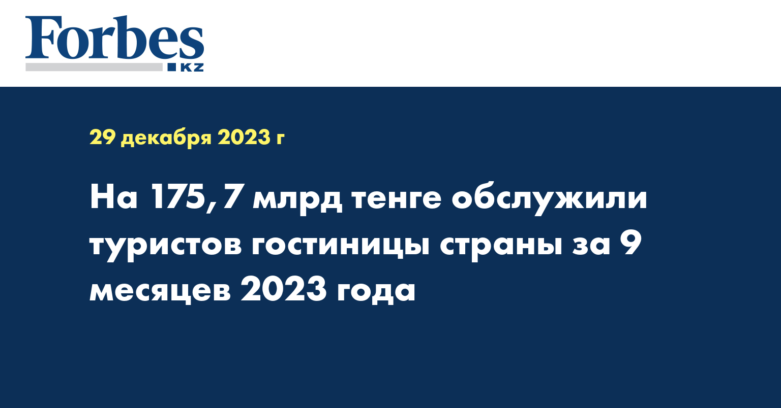 На 175,7 млрд тенге обслужили туристов гостиницы страны за 9 месяцев 2023 года. Это на 36% больше показателей за аналогичный период прошлого года. С января по сентябрь 2022 года места размещения страны обслужили туристов на сумму 129,2 млрд тенге. По сравнению с допандемийным уровнем данный показатель вырос почти в 2 раза.