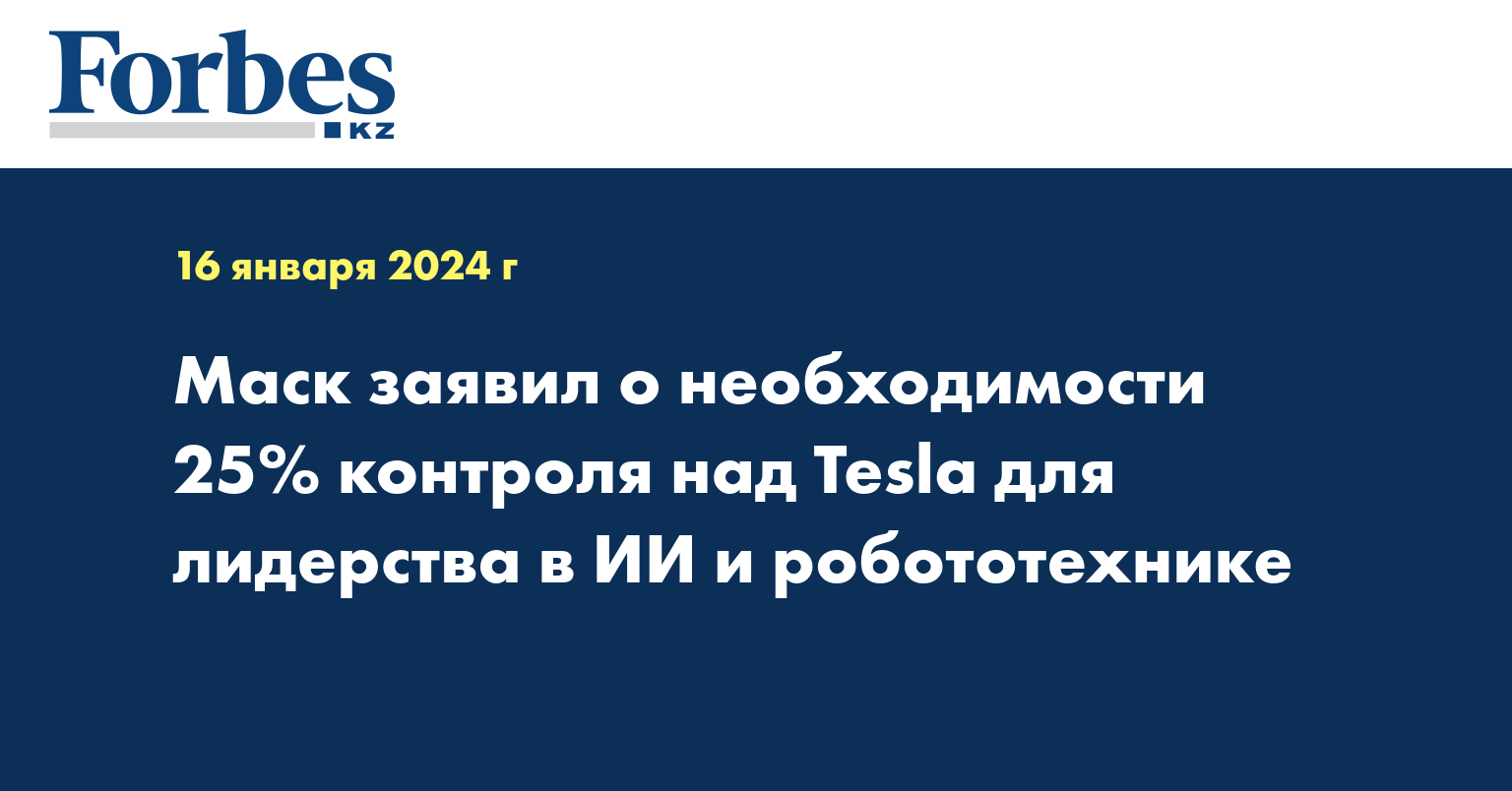 Гендиректор и основатель Tesla Илон Маск хочет получить 25% голосующего контроля над компанией, сообщает CNBC со ссылкой на посты миллиардера в X (бывший Twitter; соцсеть заблокирована в России). Сейчас Маск владеет примерно 13% акций производителя электромобилей. Это крупная доля с учетом того, что Маск продал свои акции Tesla на десятки миллиардов долларов в 2022 году для финансирования выкупа Twitter за $44 млрд с привлечением заемных средств, отмечает CNBC, передает Forbes.ru.