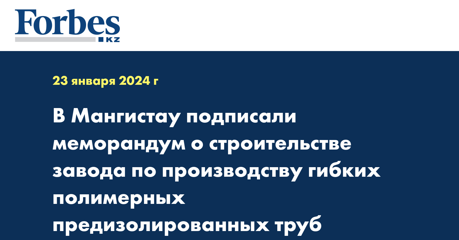 Для установления взаимовыгодного сотрудничества акимат Мангистауской области и ООО «Европейские трубные системы» подписали меморандум о сотрудничестве в реализации проекта «Строительство завода по производству гибких полимерных предизолированных труб для теплоснабжения, горячего водоснабжения и промышленности в Мангистауской области».
