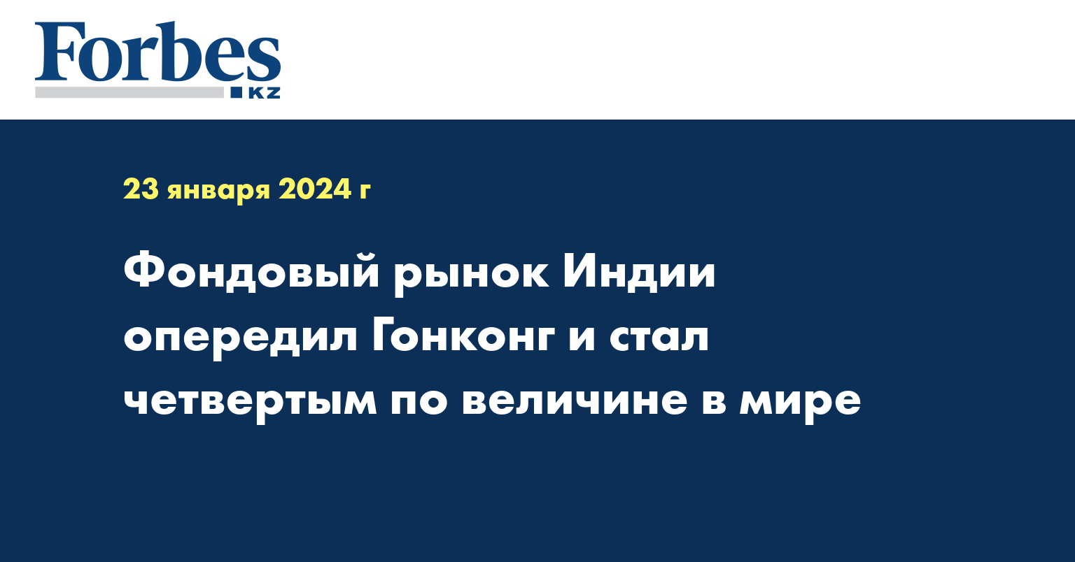 Совокупная стоимость акций компаний, котирующихся на биржах в Индии, на момент закрытия в понедельник, 22 января, достигла $4,33 трлн, в то время как в Гонконге — $4,29 трлн. Таким образом, индийский рынок акций стал четвертым по величине в мире, отмечает Bloomberg. 5 декабря 2023 года его капитализация впервые превысила $4 трлн, причем около половины этой суммы прибавилось за последние четыре года, пишет агентство.