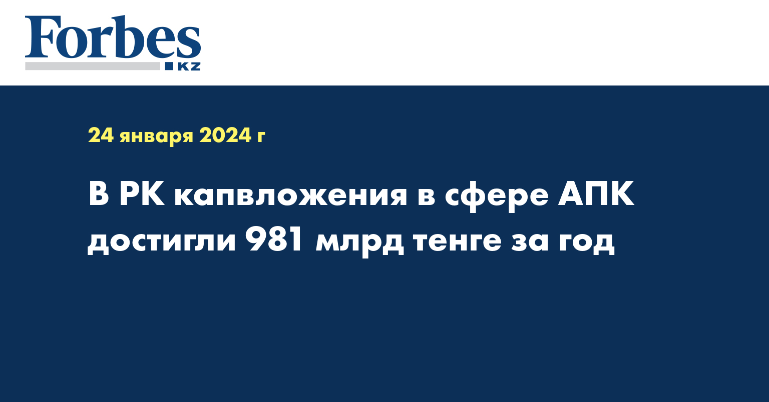 Инвестиции в основной капитал в сфере сельского, лесного и рыбного хозяйства за январь–декабрь 2023 года составили 981 млрд тг — на 14,9% больше в денежном выражении по сравнению с аналогичным периодом 2022-го (ИФО — 110,3%). Годом ранее рост составлял 10,4% (ИФО — 106,7%). Стоит отметить, что инвестиции в сферу АПК год от года увеличиваются, что особенно актуально на фоне роста цен на продукты питания, передает finprom.kz.