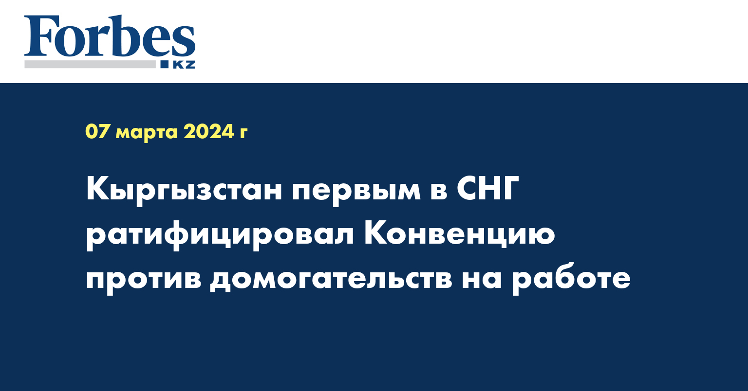 Кыргызстан первым в СНГ ратифицировал Конвенцию Международной организации труда об искоренении насилия и домогательств на рабочем месте. Об этом сообщила заместитель министра труда, социального обеспечения и миграции Жылдыз Полотова, передает издание 24kg.